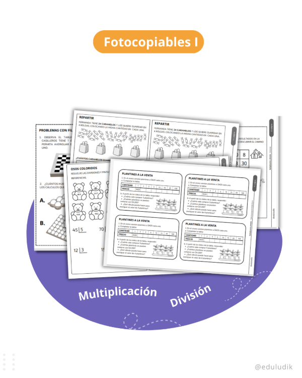 El cuadernillo Fotocopiables: Multiplicación y división I contiene actividades de multiplicación y división. Entre ellas: